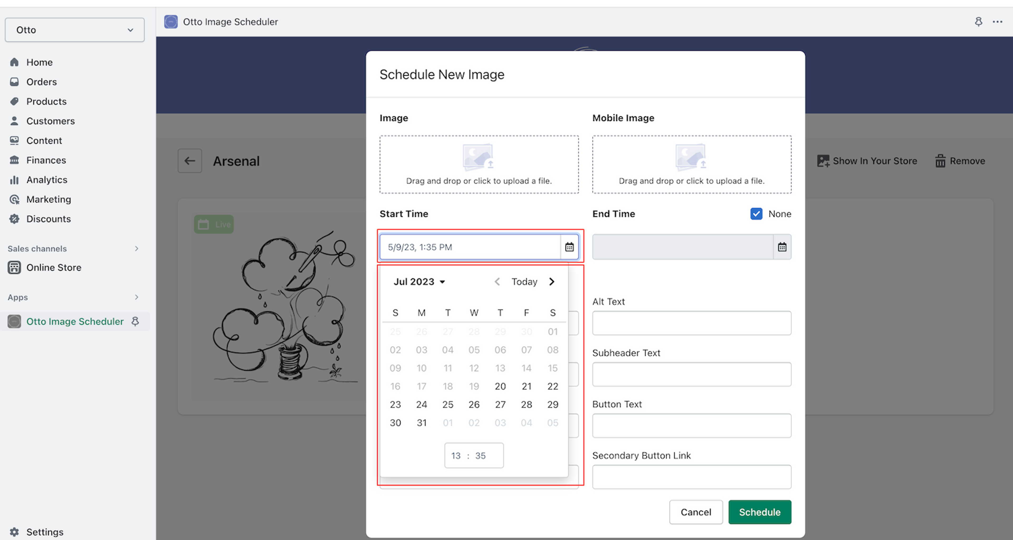 When you schedule an image, you do so in your current timezone. The app will autodetect your timezone based on the timezone your computer/device is currently set to. If you need to schedule for a different timezone then you'll need to calculate how that corresponds to your current timezone and set the time respectively.